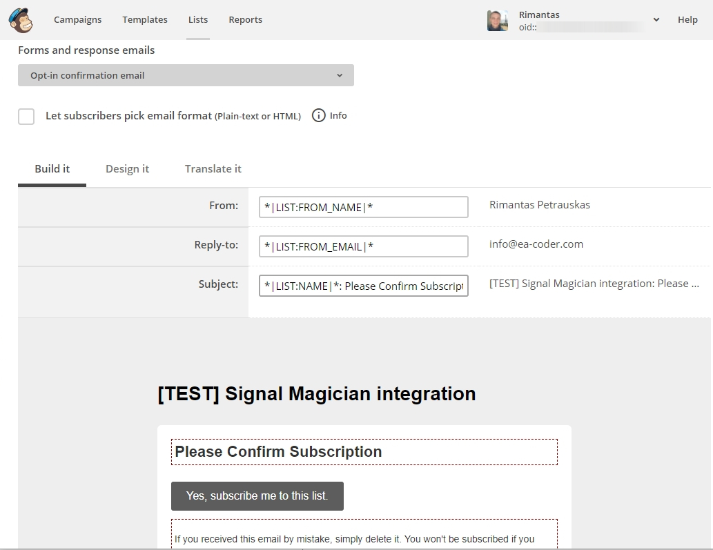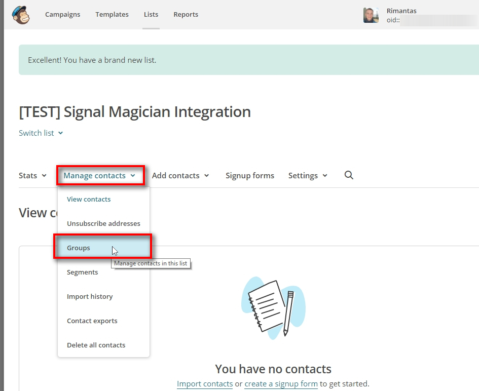 In this example, I choose the list “[TEST] Signal Magician integration (0)”. The zero here indicates the number of subscribers this list currently has.
