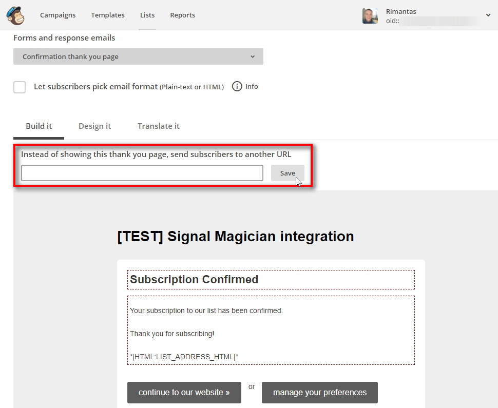Also, you can set your own URL. In such case, everyone who signups on your form will be redirected to that URL by MailChimp.