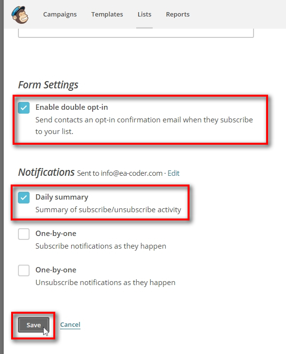 I also recommend checking the Daily summary box so that MailChimp sends you daily emails with the number of subscribers joined your list.
