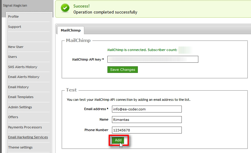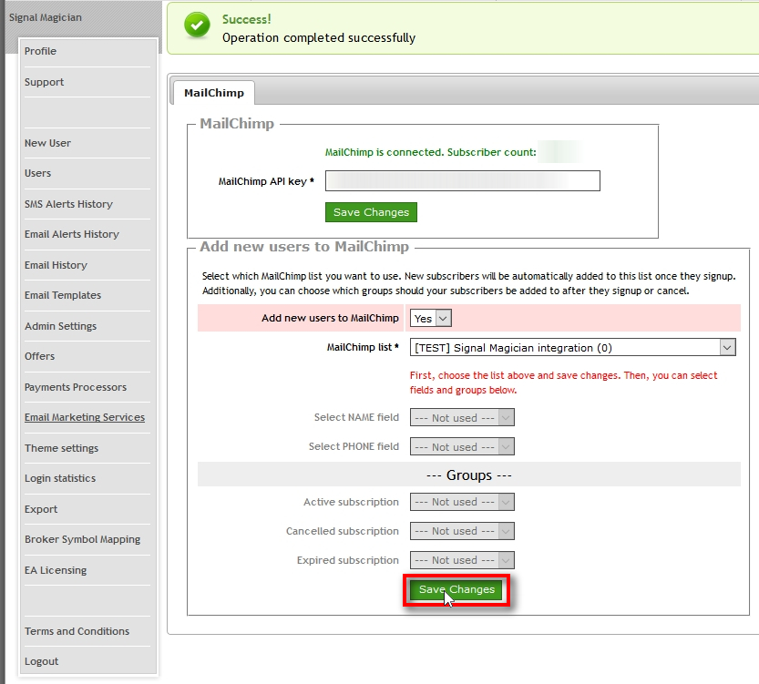 Paste the MailChimp API key to the Signal Magician web panel